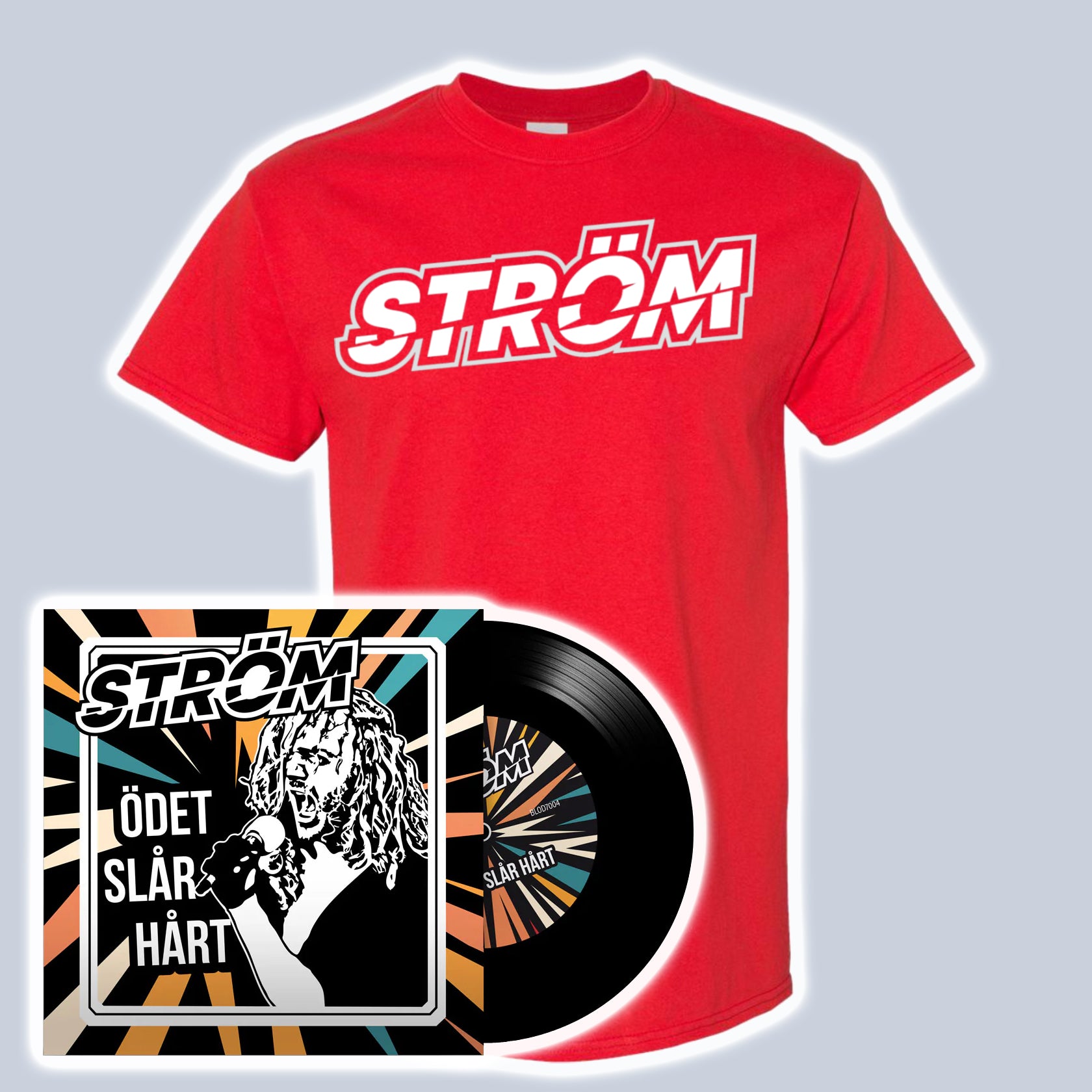 Red tee w/ white logo + 7" vinyl single "Ödet Slår Hårt" with exclusive B-side "Bedövar En Stund".